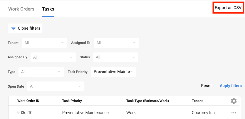 To download the Preventative Maintenance tasks you've filtered select Export as a CSV.