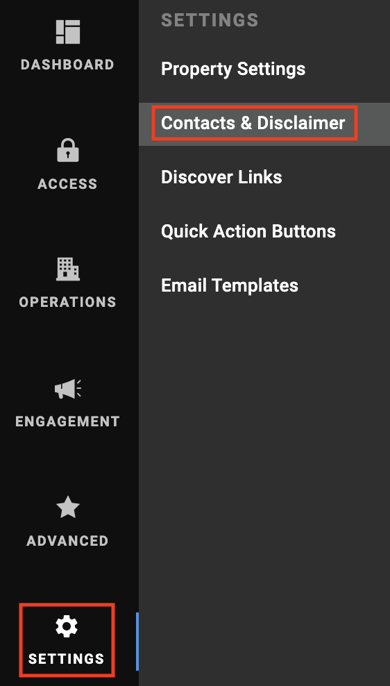 Select "Settings" from the left side of the screen, and then select "Contacts & Disclaimers."