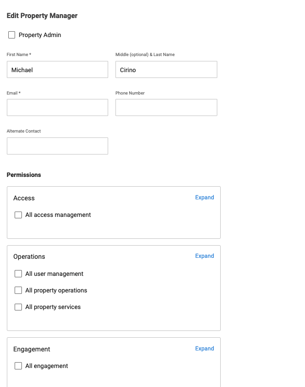 - Permissions: You can either allow the Property Admin to have full admin access by checking the box at the top of the screen next to Property Admin or scroll down to select which features you want to give the Property Admin. Property Managers that have selected permissions, will only receive emails based on the permissions they have enabled. The categories include Access, Operations, Engagement, Advanced, and Settings. You can learn more about Admin Permissions in this article!