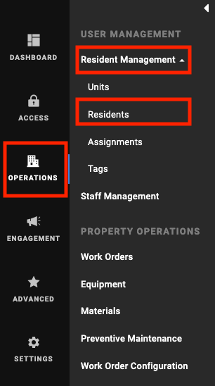 Select Operations from the left navigation menu, then select Resident Management. In the drop-down menu that appears, select Residents.