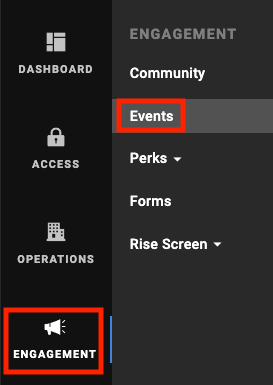 Upon logging into the Admin Portal, select Engagement from the left menu and select Events.