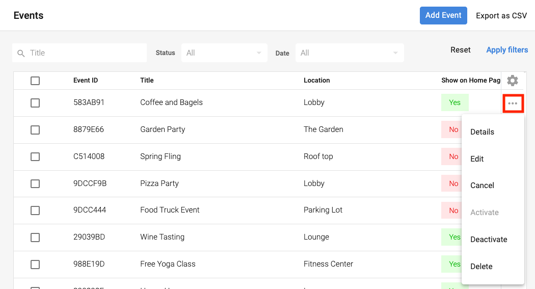 - Deactivate: Removes the event from Resident view, however, keeps the event on the Event List for management in the Admin Portal. Can be reactivated at a later date.