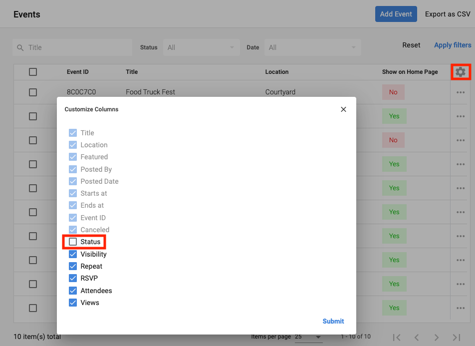 To remove the Status from the Events page, select the gear icon in the top right corner and deselect the Status box.