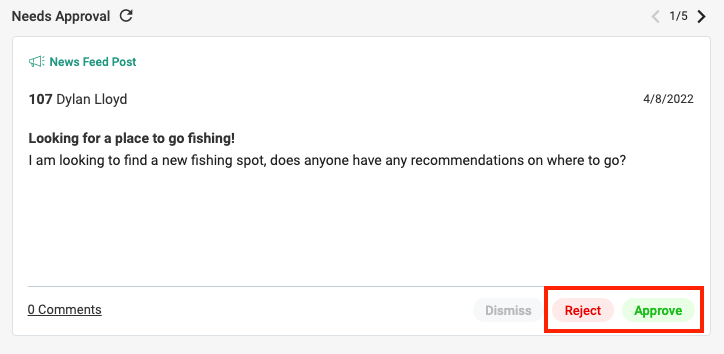 Locate Requests Pending Approval in the center panel of the dashboard. All pending reservations will appear here. Select Review in the lower right corner.