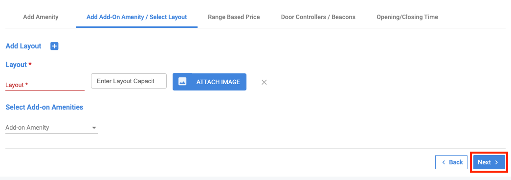 After completing the information about the Amenity, select Next at the bottom right. This will take you to Add-On Amenity / Select Layout. Here you can include different layouts that are possible for your Amenity space. For example, if you have multiple seating options for your Conference Rooms. You can even include photos. The Add-on Amenities allow you to offer additional resources in the Amenity. These are both optional.
