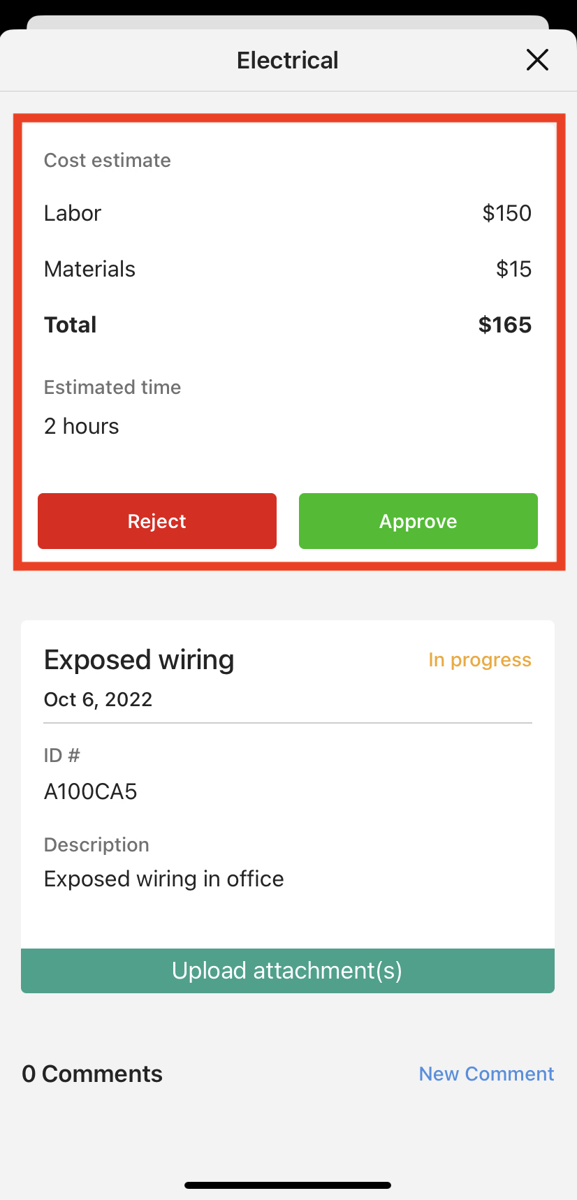 Once a work order has been submitted you may open the work order and add a comment for staff to view and communicate back. To do so, tap on the work order, then select New Comment from the bottom of the screen, and add your comment.