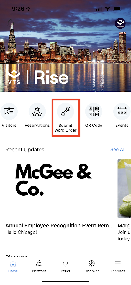 After logging into the app, select the Submit a Work Order quick action button on your app’s home screen or under features located at the bottom right corner of the app.