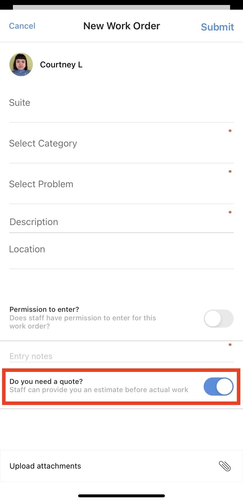 Toggle the option for Do you need a quote? This will alert property staff that you would like to receive an estimate task before work is begun on your work order.