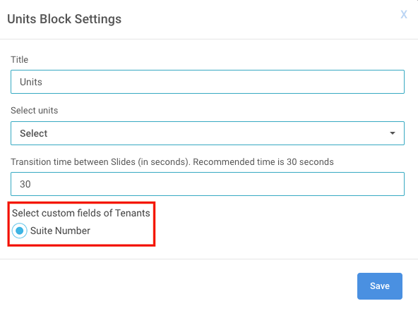 Select Edit next to the Tenants/Units Block. This will open a pop-up window allowing you to make adjustments to the settings. Under Select custom fields of tenants, select Suite Number. Select Save when complete.