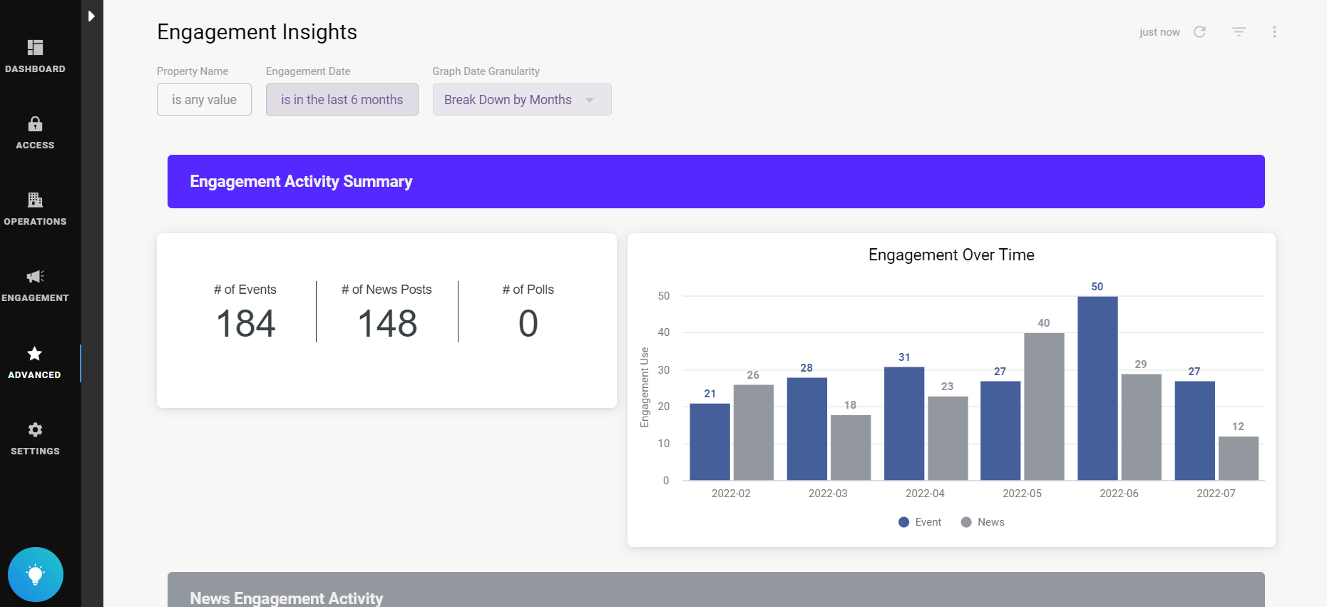 The Engagement Insights Report allow you to see the number of interactions a property's events, news, and posts have received over time.