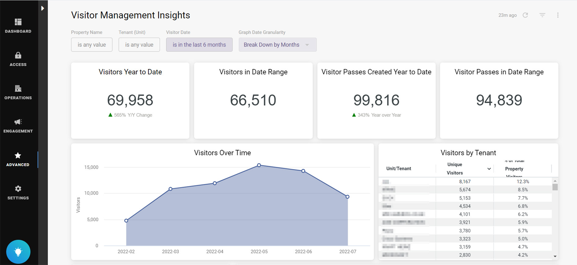 The Visitor Management Insights Report will provide you with visibility into visitor trends at your property to include visitors coming, the time and day of the week they are visiting, and what tenants they are visiting. Additionally, you can see what type of visitor passes are being created and which tenants are creating the most visitor passes.
