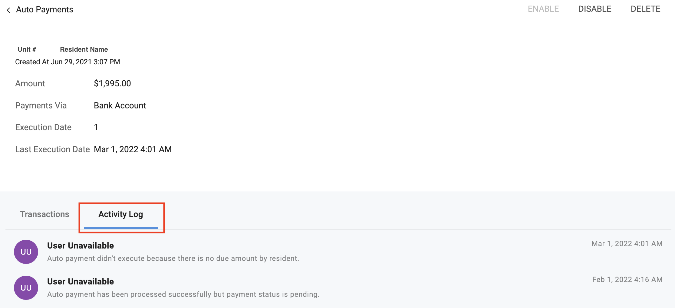 To enable, disable or delete a specific resident's Auto Payment, select the 3 horizontal dots next to the resident's name. In the drop-down, you are able to "Enable" "Disable," as well as "Delete" the auto payment.