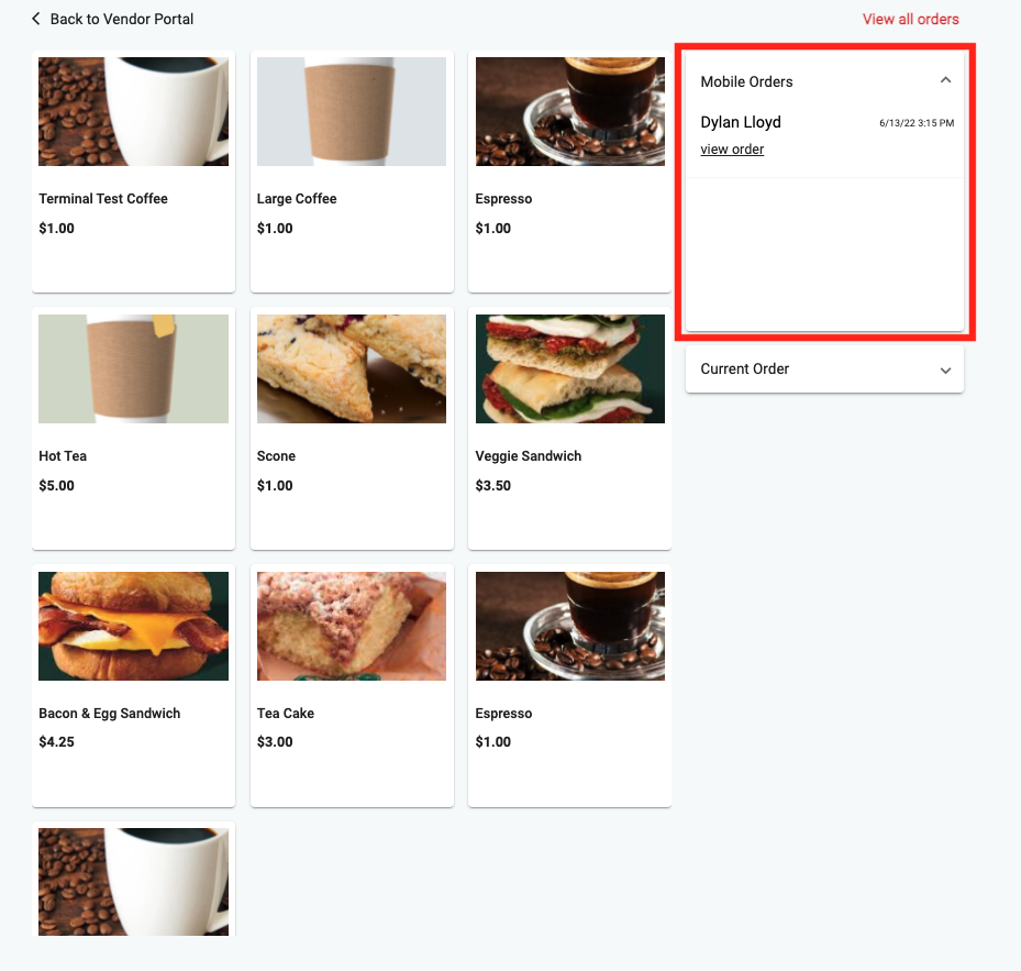 Once in the Vendor Portal POS, select Mobile Orders in the upper right. This will open a drop-down with Mobile Orders.