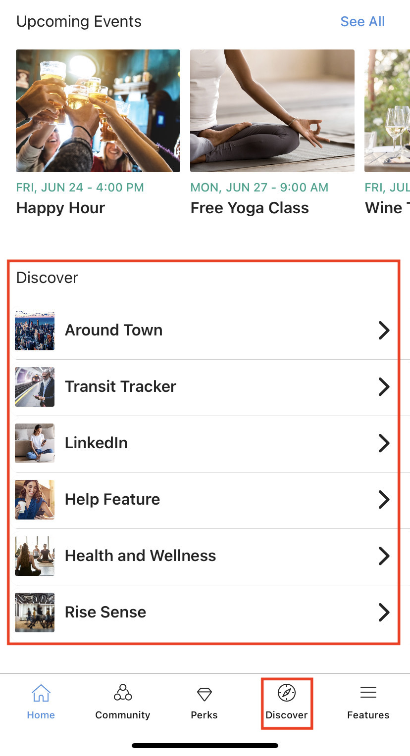 Discover Links can be found in two places in the app, the homepage and also under Discover. This is a great place to view any additional information your property wants to share with you, from building resources to things to do in your area!