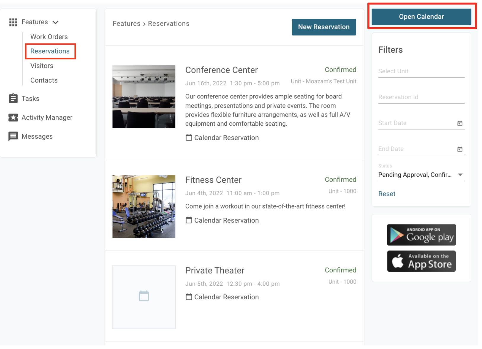 Navigate to Reservations and select Open Calendar in the top right of the screen.