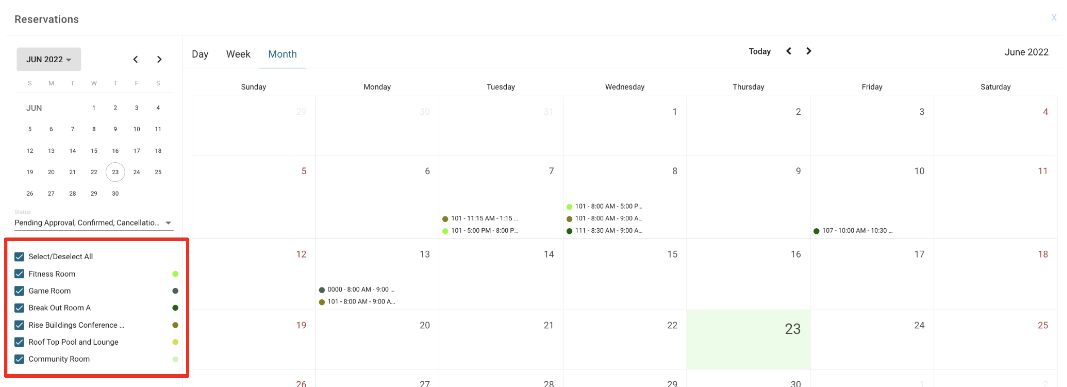 Select the filter at the bottom to select or deselect individual amenities to be shown on the calendar.