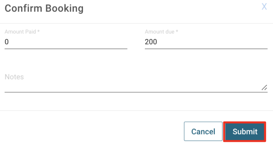When confirming a paid booking, VTS Rise will ask how much was paid at the time of the request and the amount due. Once ready, select Submit to complete the approval.