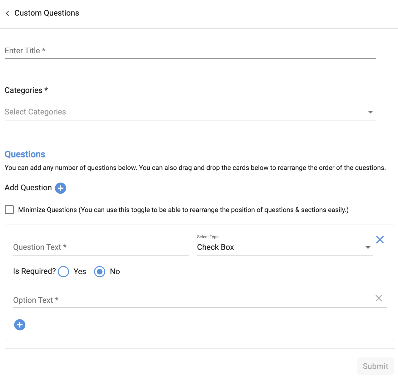 Locate the setting, Show field, Do you need a quote? and select Yes. This will show a field to Occupants allowing them to select if they would like a quote for their work order. Select Submit at the bottom of the page when you are finished.
